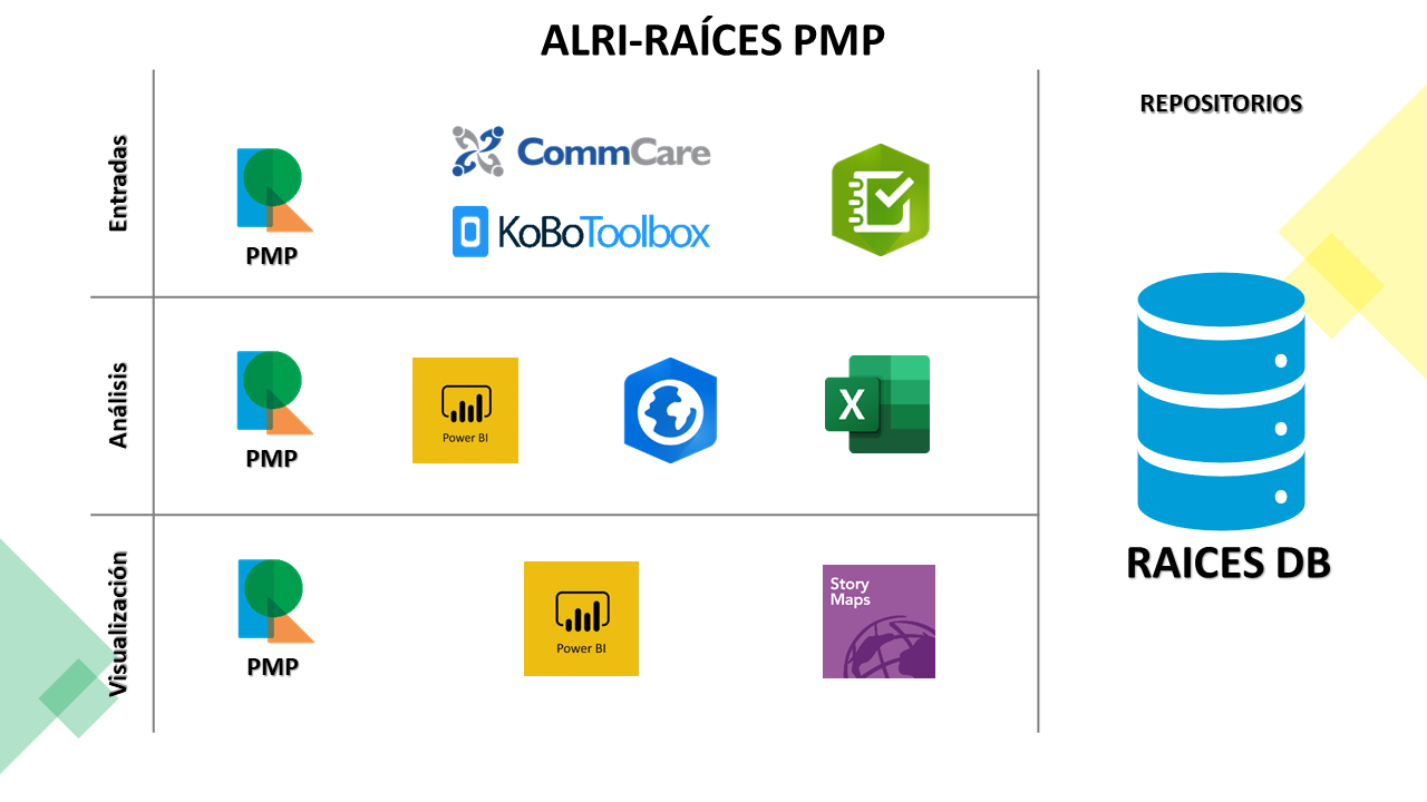 <figure><img src="https://3635169347-files.gitbook.io/~/files/v0/b/gitbook-x-prod.appspot.com/o/spaces%2F8R3k0QfPKtVn4ii6Ti8N%2Fuploads%2F9UOQc7IyhxqnXIQJHpAv%2FALRI-RA%C3%8DCES%20PMP%20-%20Entradas_Analisis_Visualizaci%C3%B3n.png?alt=media&#x26;token=64ee4f87-5529-4e99-90b6-c45dce6de173" alt=""><figcaption><p>PMP contiene formularios internos para el registro de datos, los cuales son procesados en tiempo real. Otras herramientas complementarias pueden ser utilizadas y configuradas para alimentar los datos (por ejemplo, herramientas ODK). PMP contiene paneles que permiten el análisis y visualización de datos; herramientas como Power BI, ArcGIS Pro, entre otras, pueden ser utilizadas para generar visualizaciones que abonen a la toma de decisiones.</p></figcaption></figure>